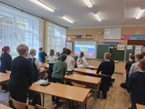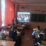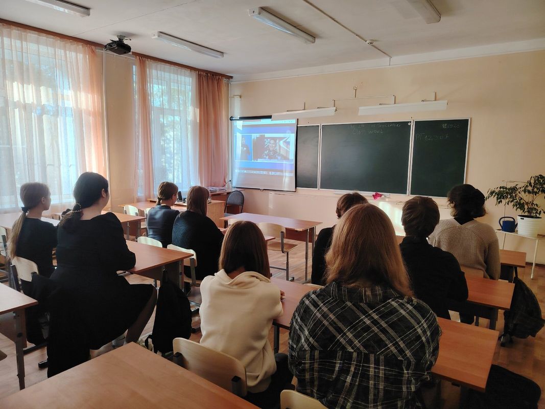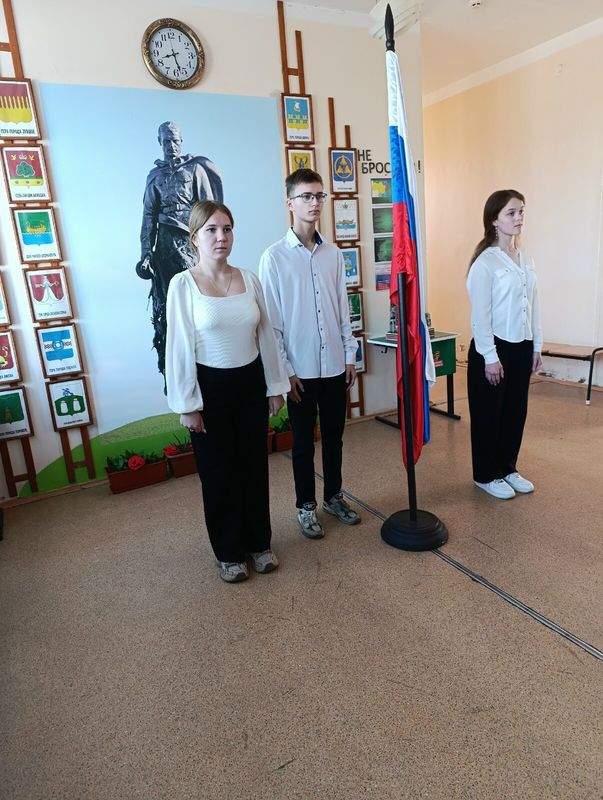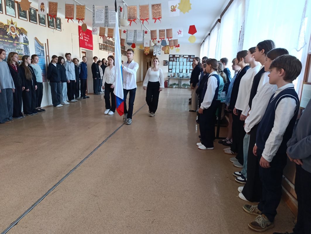 Понедельник традиционно начался с выноса флага и исполнения гимна РФ в стенах Зала Боевой Славы школы.